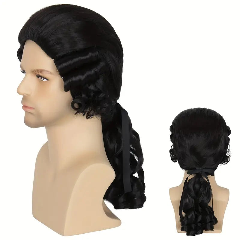 Slick back wig with curls going down either side. Curled ponytail with a ribbon to tie it.
