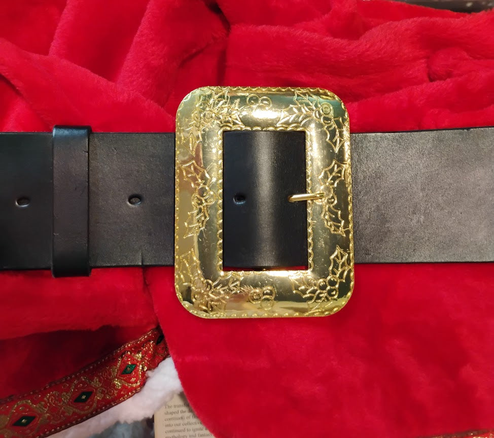 Leather. Substantial hand made black leather belt includes large cast buckle with prong.