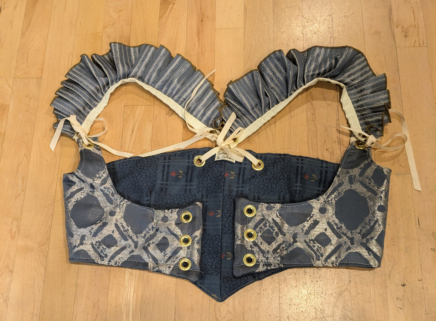 Damsel in this dress underbust corset bodice. Shorter cropped profile with ruffle bodice straps. Strong fiberglass rods by the center lacing, rigid steel boning throughout. Quality and detaled fabric for lining and outer fabric giving the piece structure . Reversable, vintage. $35 rent