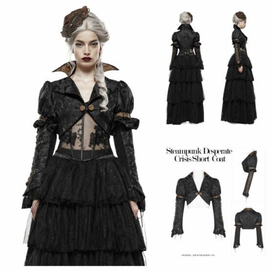 Black brocade short coat jacket with a big double stand up collar. Lined in a brown Brocade fabric. Long sleeves are lace up with a lace cuff and an elastic backing to give some adjustability to them. Puff sleeve with a brown buckle around forearm.