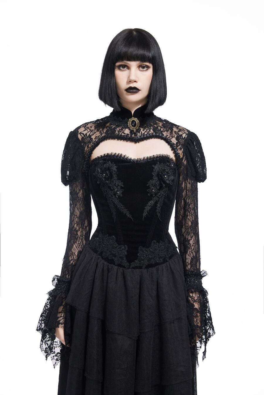 Full length sleeves with a high collar and a clasp at the neck. Big puffy cuffs with a ribbon at the wrist. Puff sleeves. High collar velvet neckline with a black gem at the center. 44002