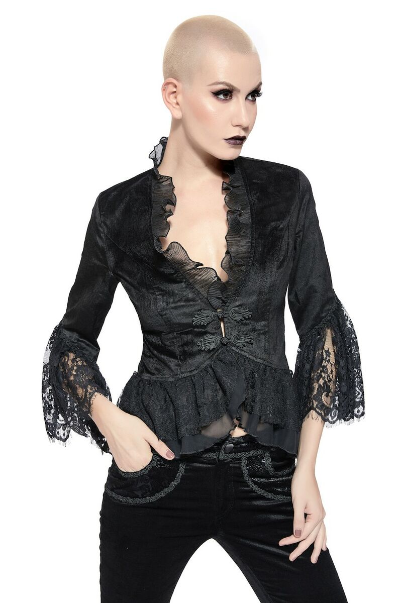 Quarter length sleeved button up bolero jacket perfect for an 18th century lady or a Vampire. Frills around neck and chest. Velvet base fabric with lace details on the sleeves and on the waist line. 2 center hook and eye buttons to close.