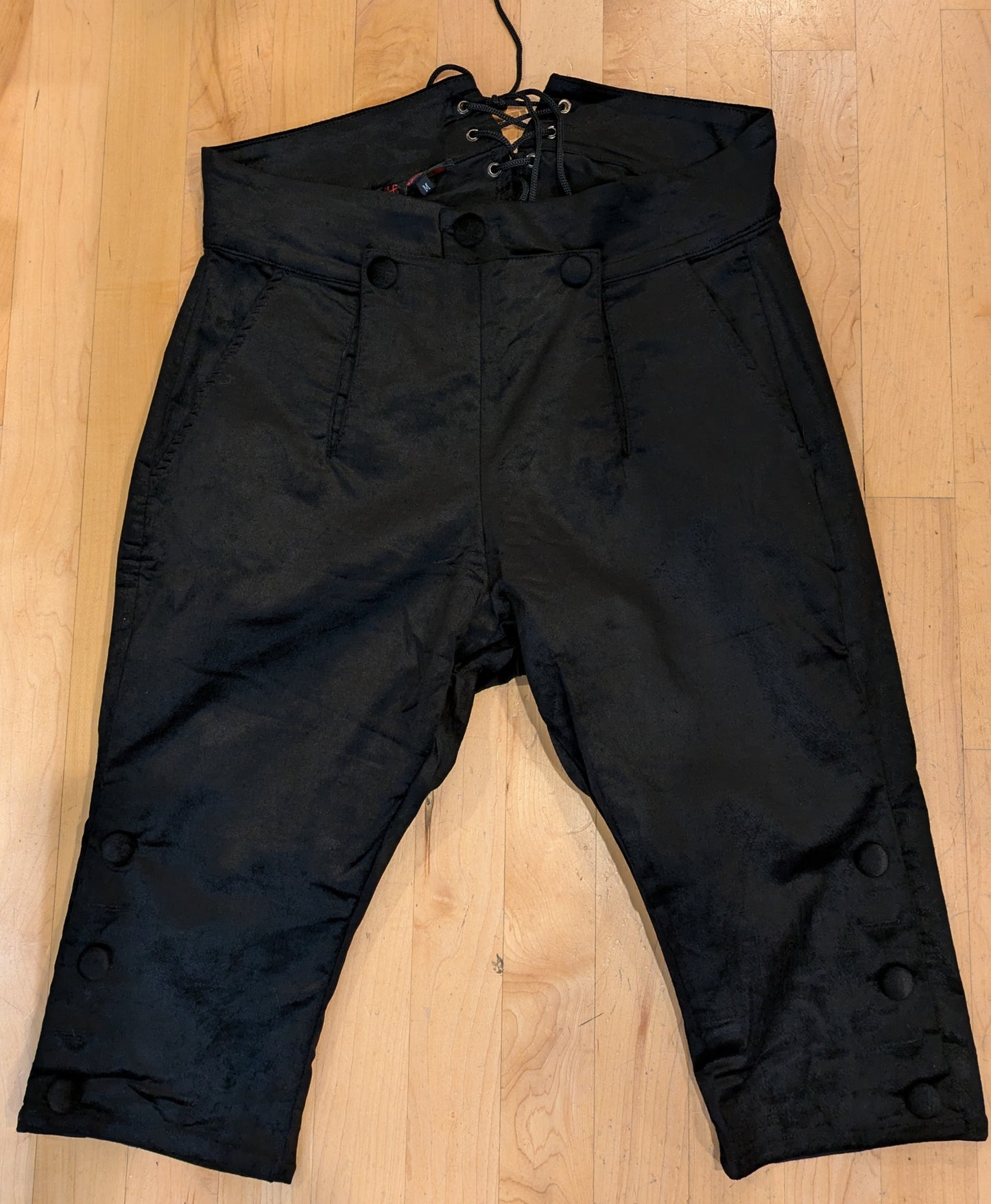 18th century style knee pants. Button up fly with a pull over sailor style flap. Buttons up the leg with a corset lace up backing. Perfect for any 18th century style outfit.
