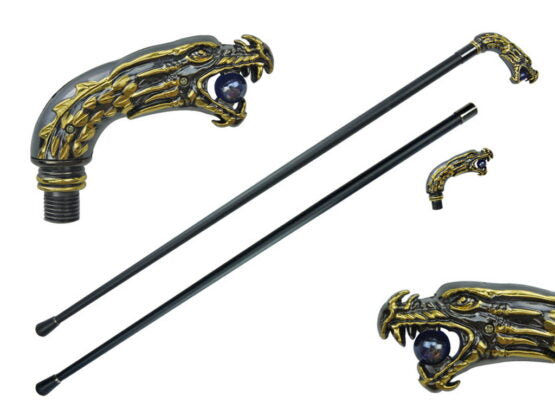 36" cane with removable topper. black cane with silver dragon head with a blue ball in his mouth with bronze scales