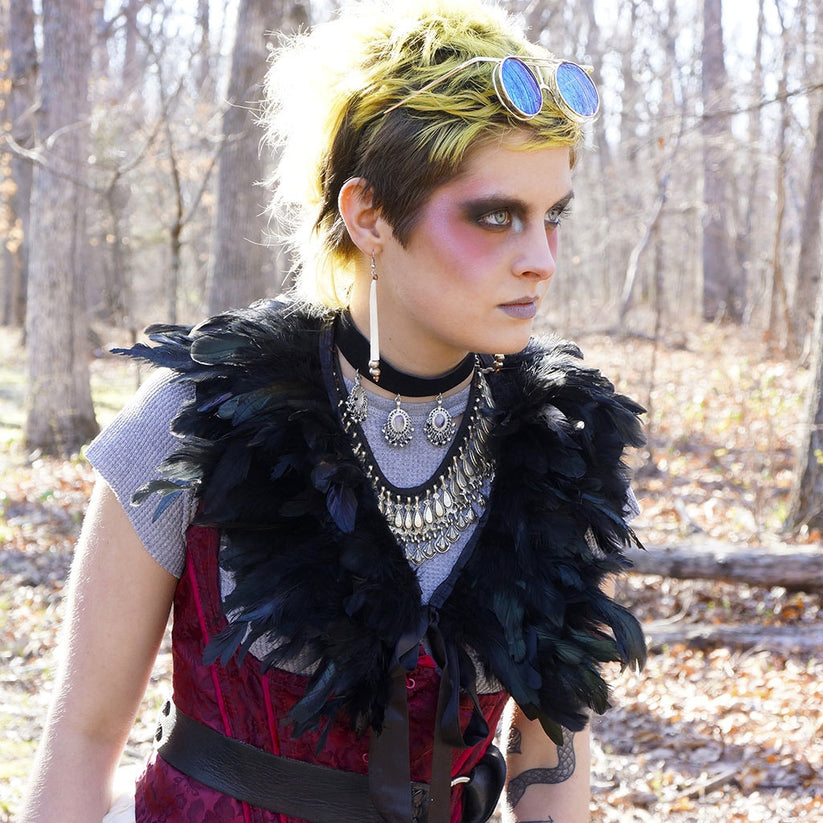 Rooster Coque Feather Cape Collar with Satin Trim & Ribbon Ties measures 7"x26". This luxurious iridescent rooster coque feather cape is lined with black satin and worn comfortably over the shoulders.