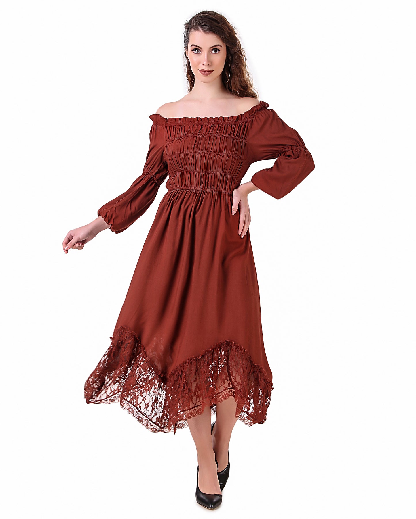 Chocolate. Rayon dress for pirates or renaissance. Elbow length sleeve with elastic cuff. Lace netting on bottom of dress. C1653