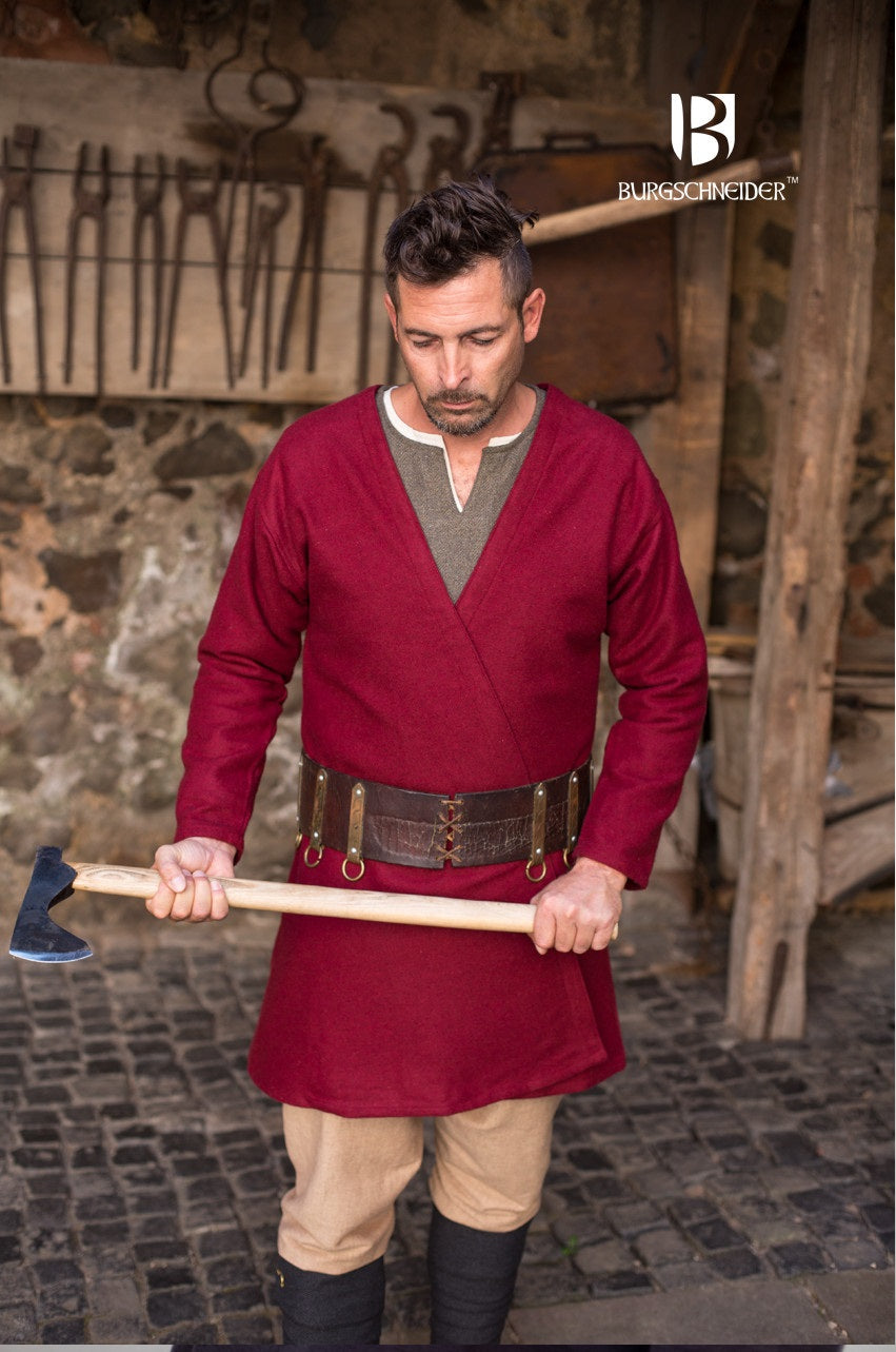 Maroon Wrap Viking coat 74% Wool, 15% Polyester, 7% Polyamids and 4% misc. Natural Fibres. The heroic clothing for medieval reenactment and live action role play. Event, Festival, Convention, Stage, Film, and beyond.