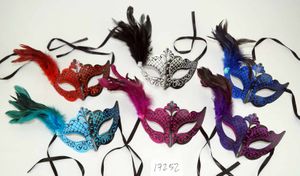 Half black half color mezza with filigree scroll swirls. Coque feathers and jewel on right temple.