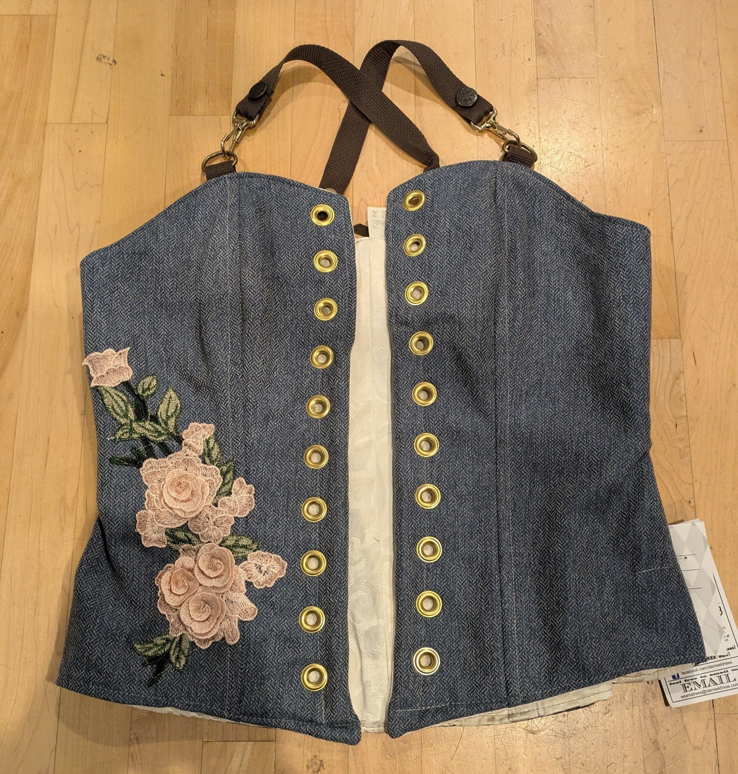 Damsel in this dress branded overbust corset with shoulder straps and a flower aplique. Strong fiberglass rods by the center lacing, rigid steel boning throughout. Brown shoulder straps. Quality and detaled fabric for lining and outer fabric giving the piece structure . Reversable, vintage. $50 rent