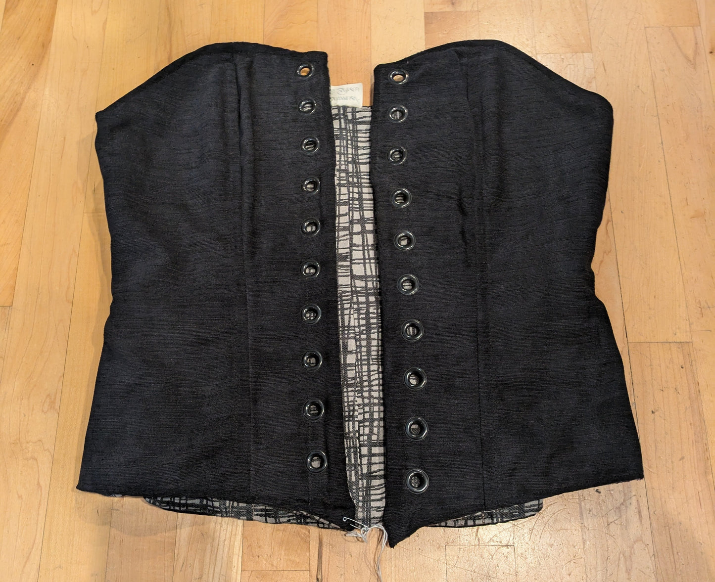 Damsel in this dress branded overbust corset. Strong fiberglass rods by the center lacing, rigid steel boning throughout. Quality and detailed fabric for lining and outer fabric giving the piece structure. Single row of front lacing that flares out around the bust line . Reversible, vintage. $50 rent