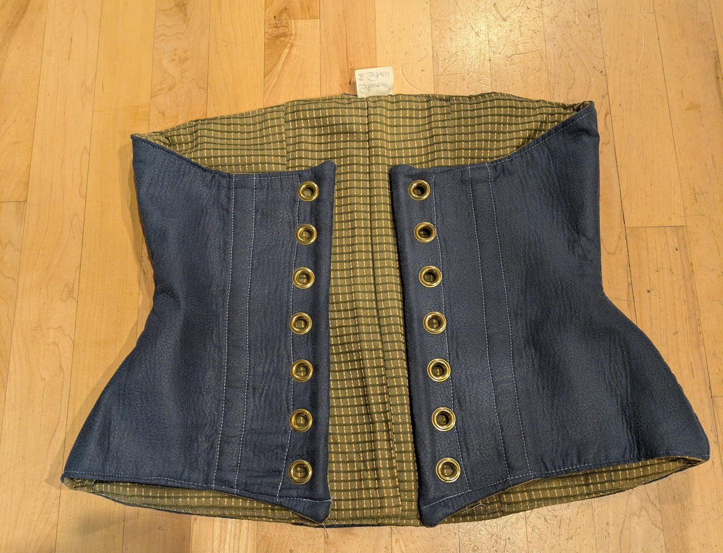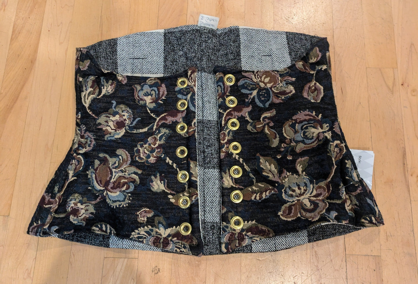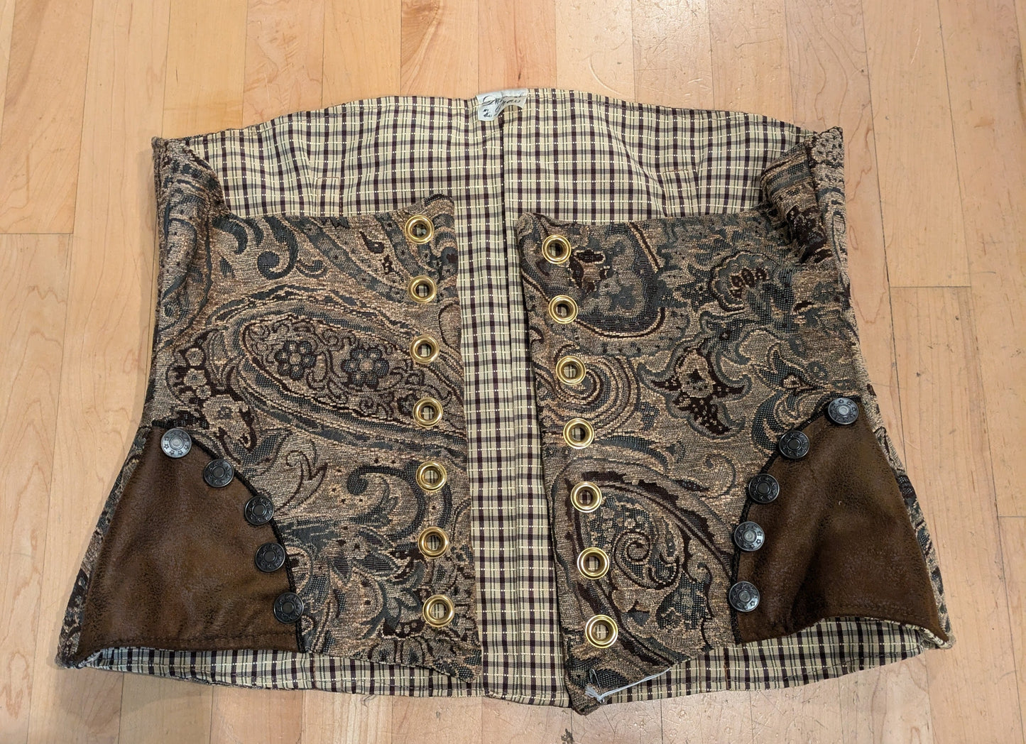 Damsel in this dress branded underbust corset. Longer Profile Victorian style. Strong fiberglass rod at the center lacing, rigid steel boning throuhgout. Quality and detaled fabric for lining and outer fabric giving the piece structure . Reversable, vintage. $45 rent