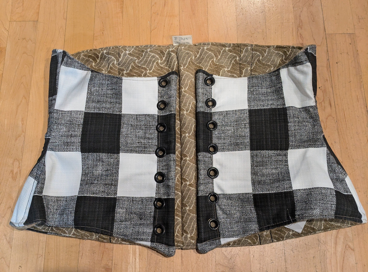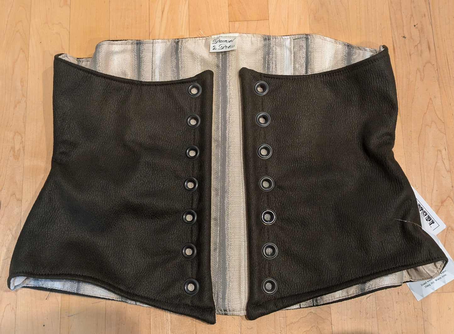 Damsel in this dress branded underbust corset. Shorter profile. Strong fiberglass rod at the center lacing, rigid steel boning throughout. Quality and detaled fabric for lining and outer fabric giving the piece structure . Reversable, vintage. $40 rent