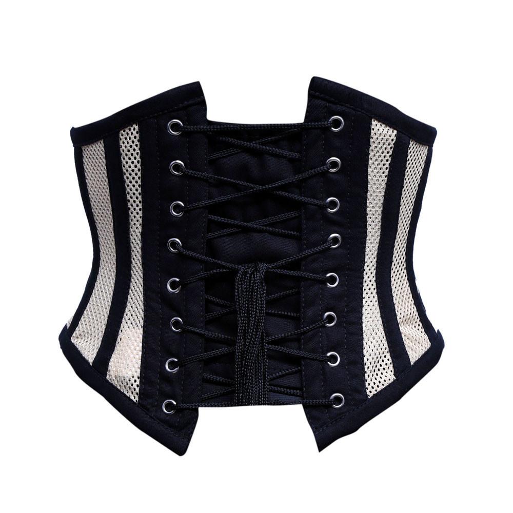 spiral steel boning boned, underbust. Beige, tan and black underbust. Black lined steel bones with mesh panels. lace up back snaps in the front.