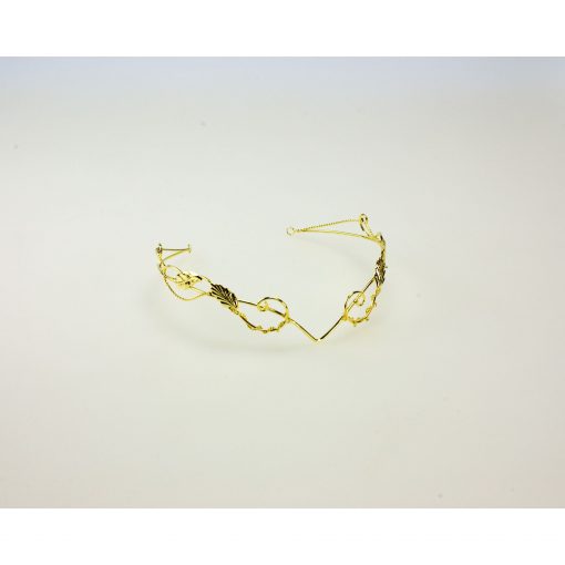 gold finish metal tiara, vine and leaf leaves motif. Open back can be secured with a ribbon (tied closed with a ribbon in the two loops). Ribbon not included.