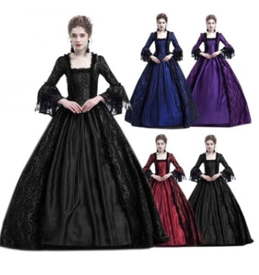 18th century styled floor length ball gown. Square cut neckline with elbow length sleeves with a flare with lace edging. Damask velvet material, curtain style skirt with a plain colored center. Comes with a tulle hoop skirt.