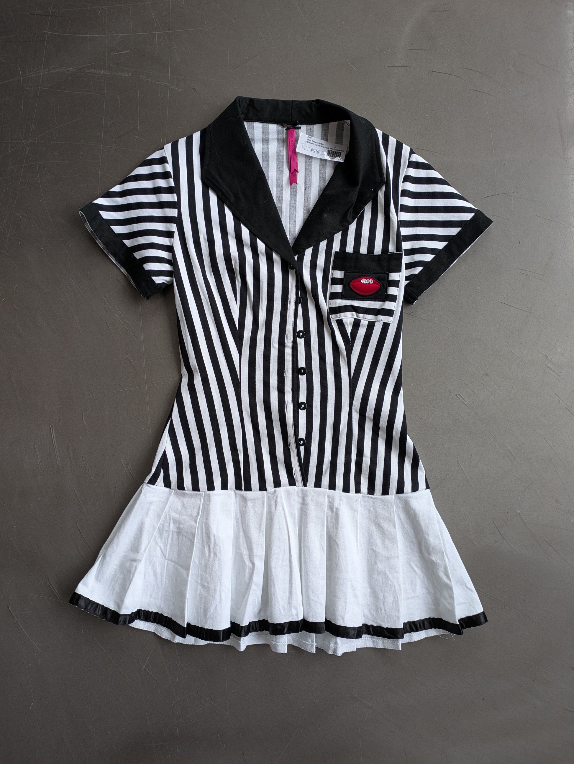 Serve til Midnight referee costume for women's. Cotton Short sleeve short skirt low cut. 30" Chest, 32" Waist, 8" Skirt Length.
