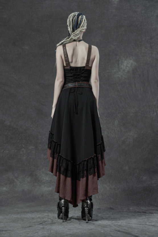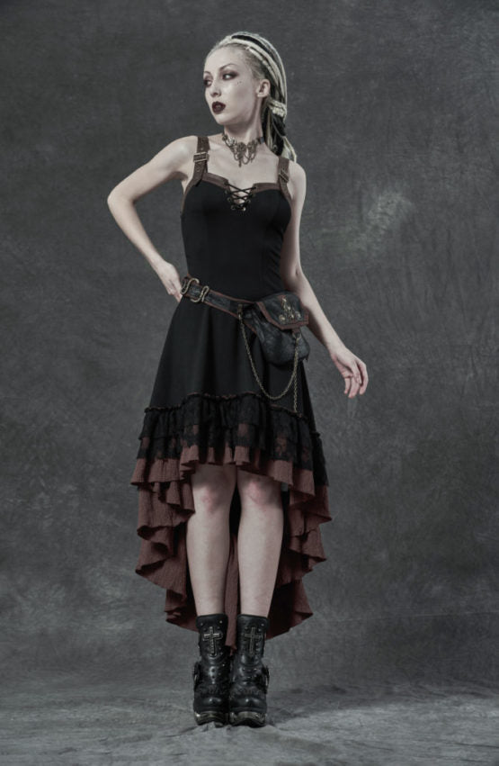 Black and brown sleeveless high low dress. Black dress with brown straps, grommets, buckles. Lace up corset back for adjustable sizing, and a brown layered hem line with some lace. Perfect for an adventurer or post apocalyptic warrior.