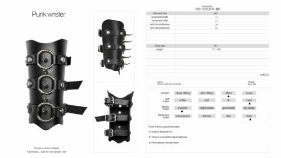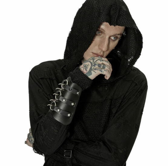 Black faux leather single arm bracer or vambrace with studs and spikes. 3 buckle closure on back to attach to arm. $15 rent