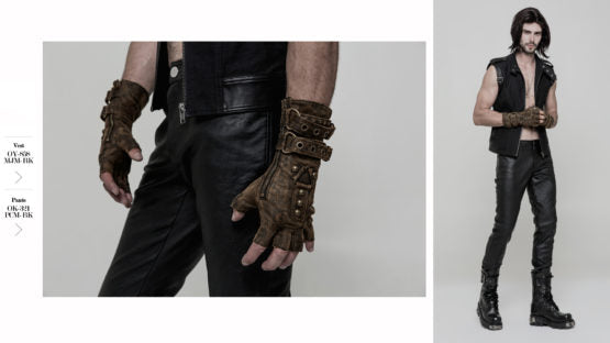 Grey fingerless gloves with silver rivets, zippers, and buckles. Punk rave