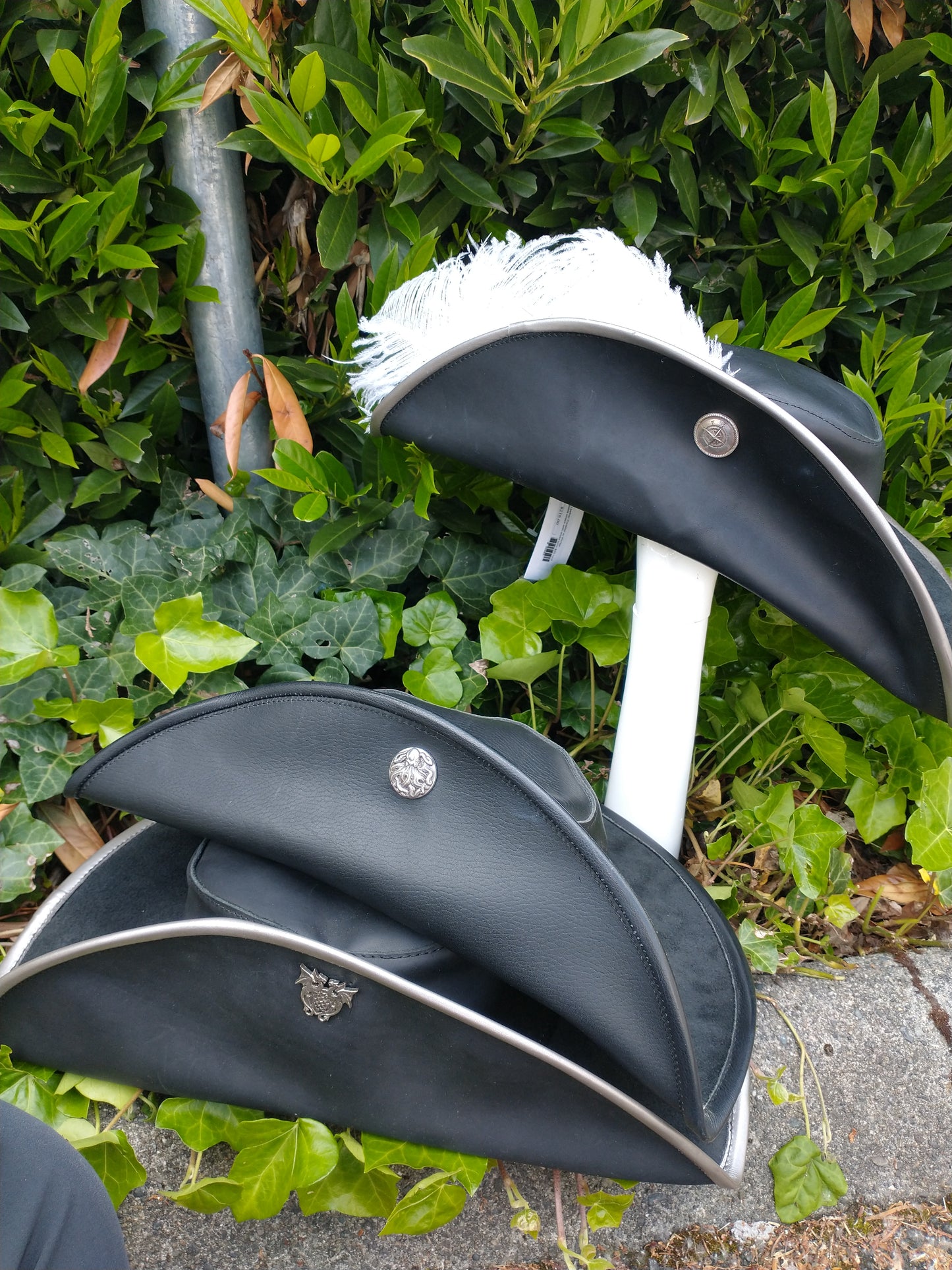 moldable shape with wired brim, secured with assorted conchos on one end like a musketeer, handmade by local artist Victor Moray. works for Pirate. $20 rent