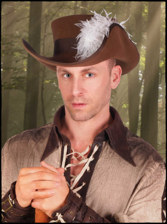 Brown Wool felt musketter hat with white feather.