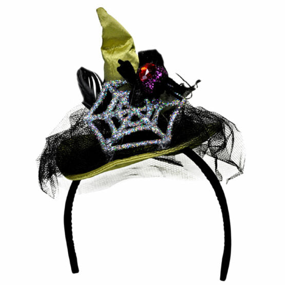 Headband mini witch hat, black purple, bats, spiderwebs, feather, fabric flower