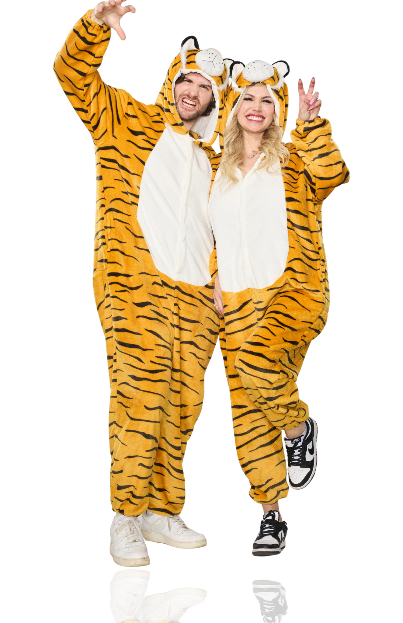 Hooded onesie kigurumi with a zip up front. Fuzzy material with a cute face on the hood. Orange and black tiger stripes with a beige belly and cute face