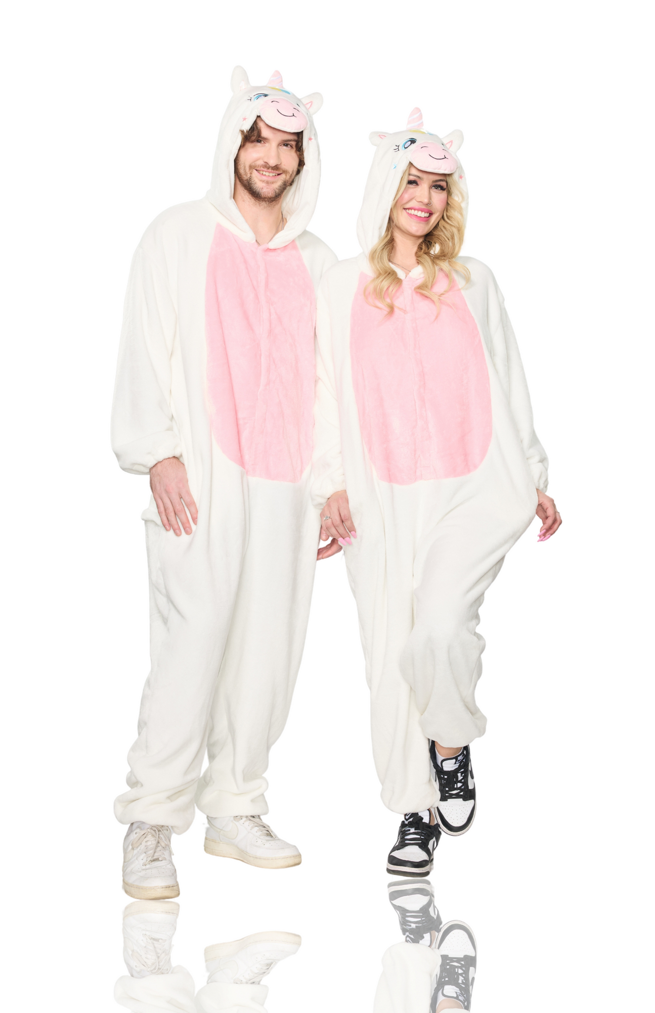 Hooded onesie kigurumi with a zip up front. Fuzzy material with a cute face on the hood. White fur and pink belly with a cute unicorn head