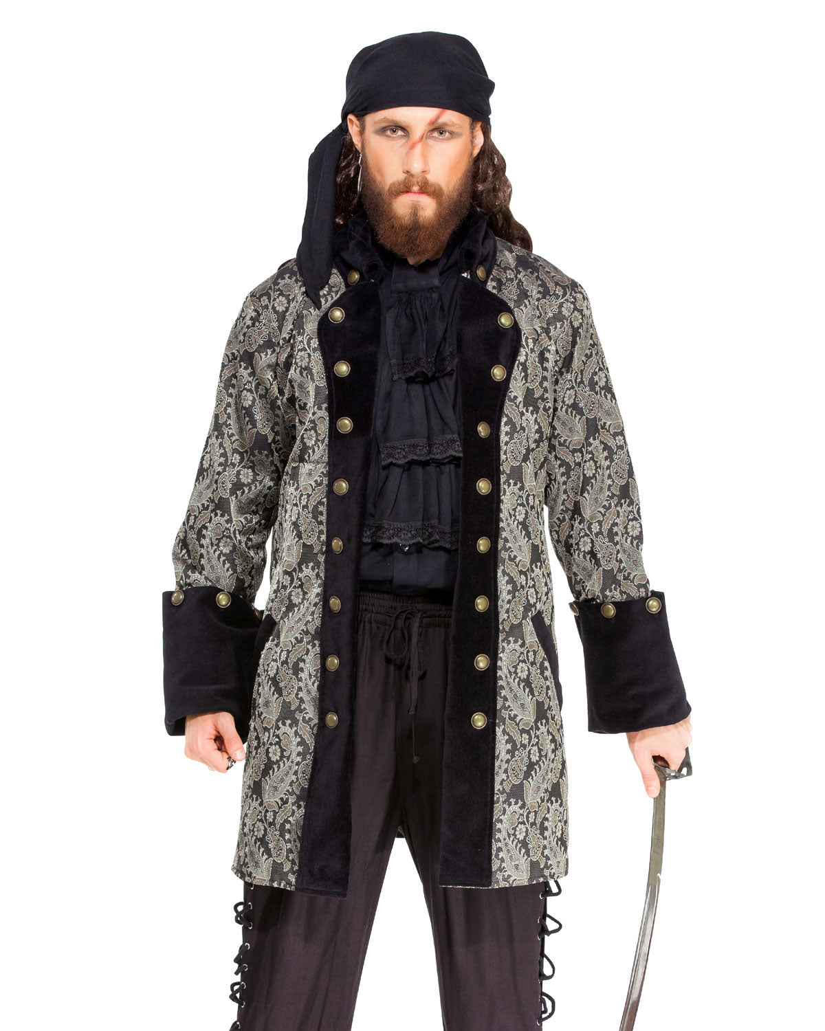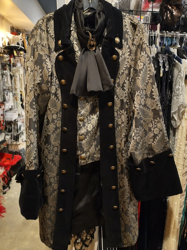 Frock coat in brocade fabric with Satin Lining, Large Bell Cuffs of black velvet, Metal Buttons, and Functional Pockets. Fancy Rococo Masquerade Attire, or cool Pirate Captain Jan De Bouff C1412