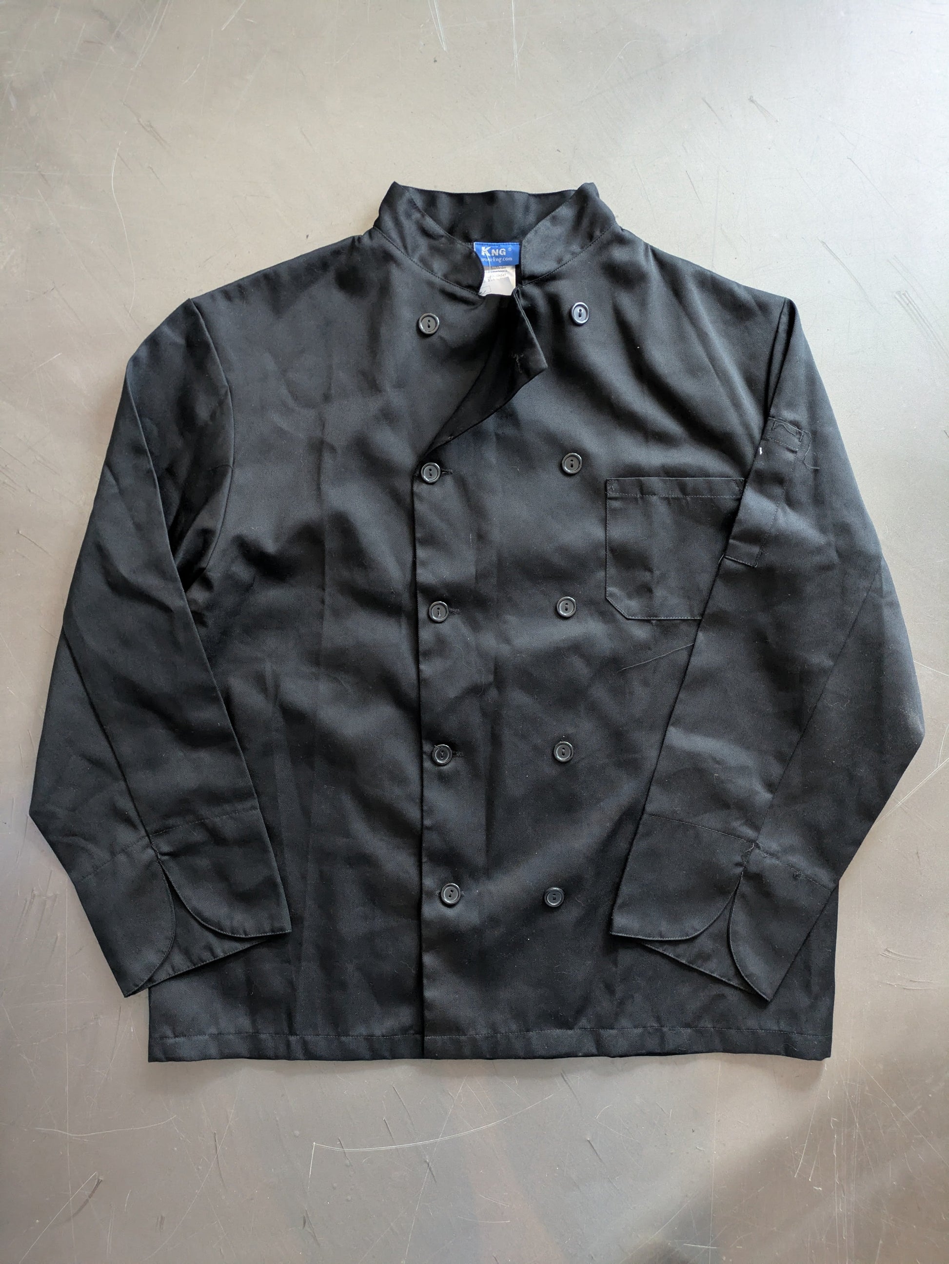 Authentic, real, used all black chefs coat. Double breasted 2 rows of buttons. Long sleeves. 50" Chest. $15 rent