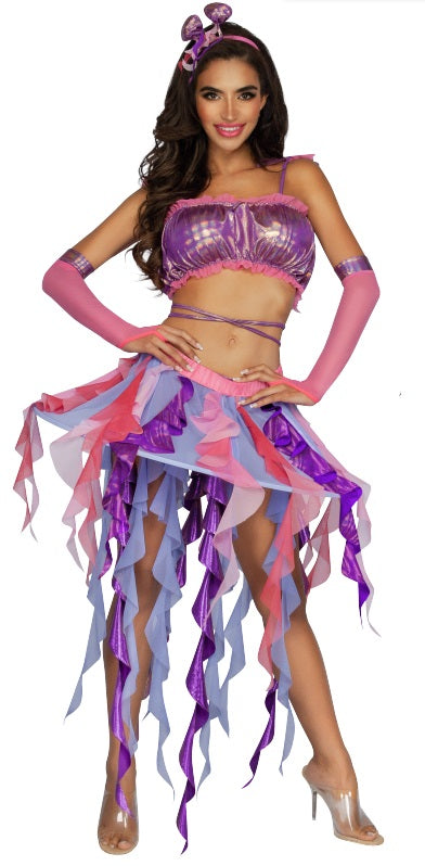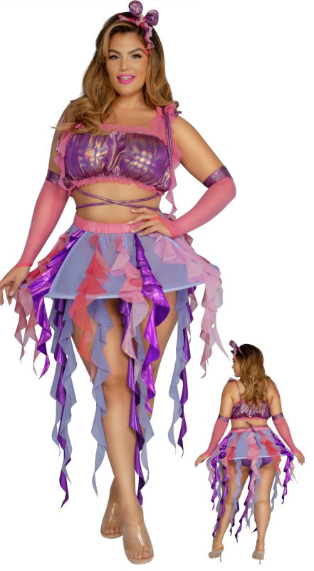 Jellyfish set with iridescent metallic spandex througout, multicolor ruffles throughout, and hoop skirt. Includes jellyfish headband, matching shorts and gloves. Starline, LLC.
