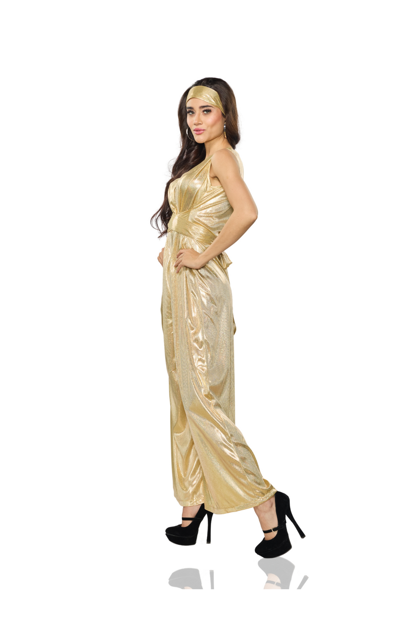 Disco flare romper in a sparkle glitter fabric. Sleeveless neck wrap with attached belt and matching headband.
