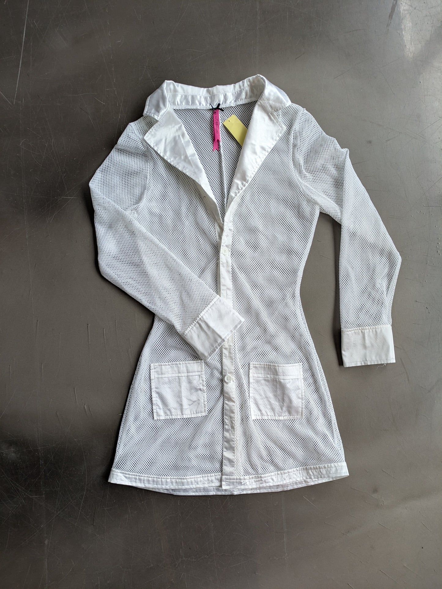 Halloween costume nurse or doctor. All mesh with white satin collar and cuffs. 32" Chest, 24" Waist, 12" Skirt Length.