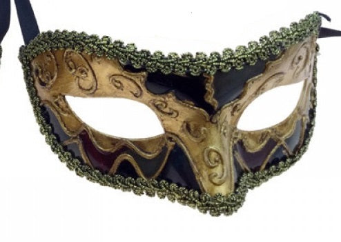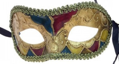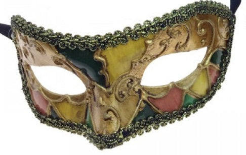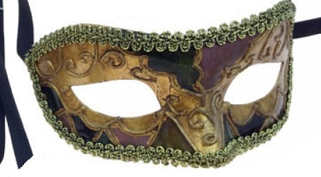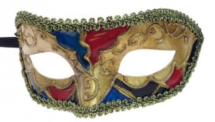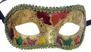 Petite colombina shaped venetian style mask with different spots of color and gold metallic with gold trim.
