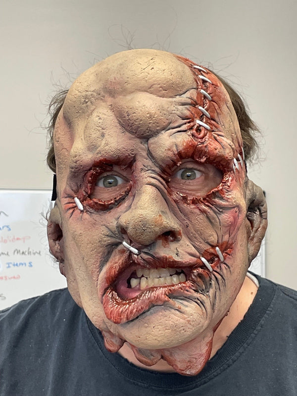 Introducing Skin Deep latex mask, a one-of-a-kind collectible sculpted by Aaron Lewis. With a classic skinned face look. He is one of a kind. Every time you think he's done and falls apart we just stitch him back together. Whatever you do don't let him near power tools! Sculpted by Aaron Lewis he looks like a classic horror mask yet. $25 rent