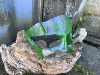 green / purple depth of color leather mask, handmade by FaceOdd Leather Art, using a softer pliable light weight leather for greater comfort and fit, even over eye glasses. Universal fit. Urban Fae Collection. Dragon, troll, other fantasy character possibilities