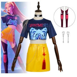 K-pop demon hunter costume includes a Crop top with printed design, single epaulet, printed tights, pleather yellow skirt, skirt chain, red skirt charm, choker necklace, and dangle earrings.