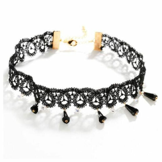 Thin black lace choker with hanging black and clear beads