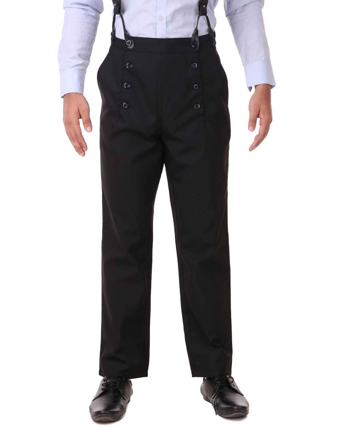 Black - high-waist Victorian cut steampunk trousers, front flap with buttons, waistband buttons for suspenders, buckle w/strap on back.
