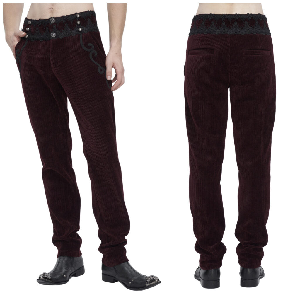 Velvet wide corduroy trousers with macramé detailing by the front pockets and on the waist line of the pants. Perfect for any masquerade ball or elegant vampire look.