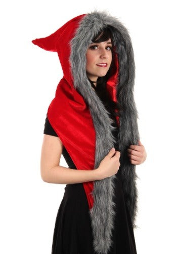 Velvet red hood with grey fur trim. Could be the wolf or the girl
