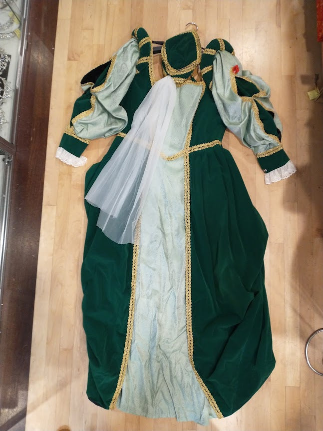 Velvet dress with slash sleeves and brocade inset, padded rolls at shoulders. deluxe theatrical costume shakespearian , Tillie Beige Biege