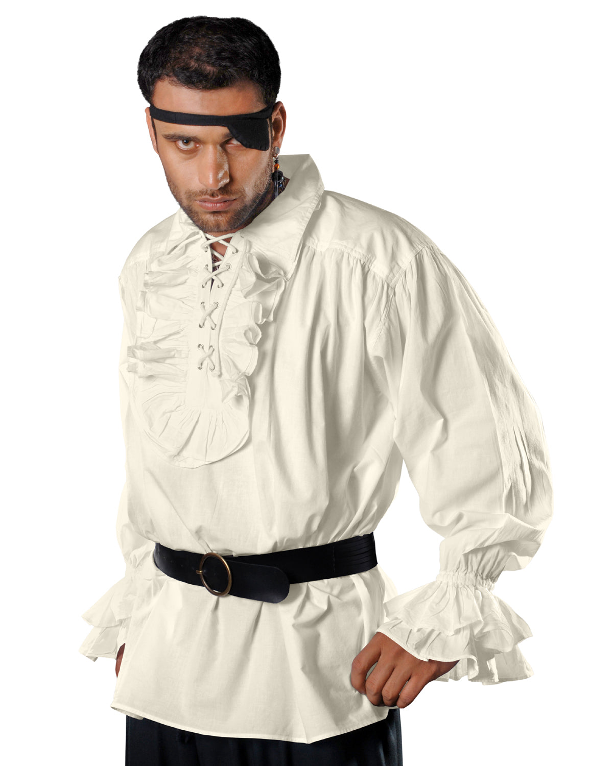 C1011 Off White, Natural, Ivory, Cream. Pirate shirt with big front ruffles around collar. lace up front. Big cuff ruffles. Cotton