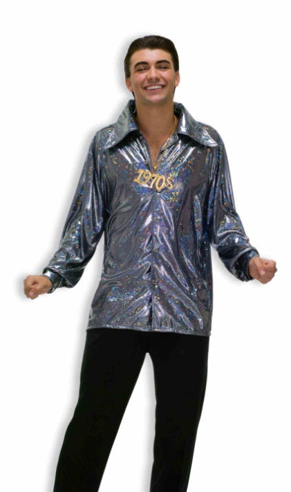 Butterfly collar disco style shirt with a silver rainbow hologtaphic fabric.