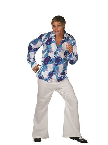 1970's style shirt with a blue, purple, and white pattern. Butterfly collar and blousey sleeves.