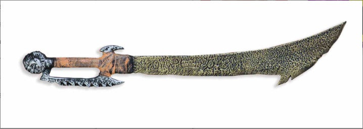 Plastic distressed styling sword with a hand guard and a curved serrated blade