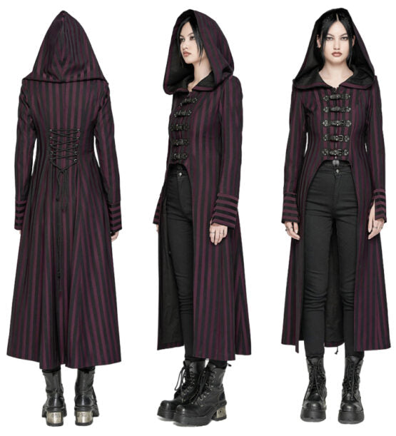 Long tailcoat jacket with oversized hood. Buckle closure down the front. Regency cut. Vertical burgundy and black stripe for a steampunk look.