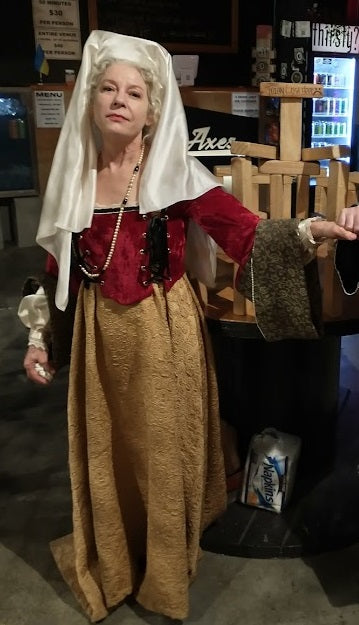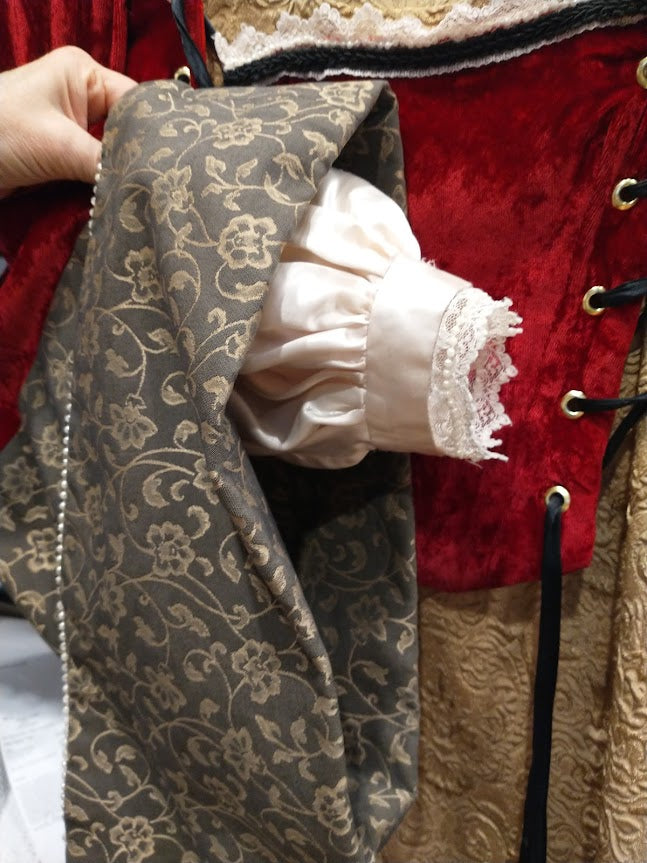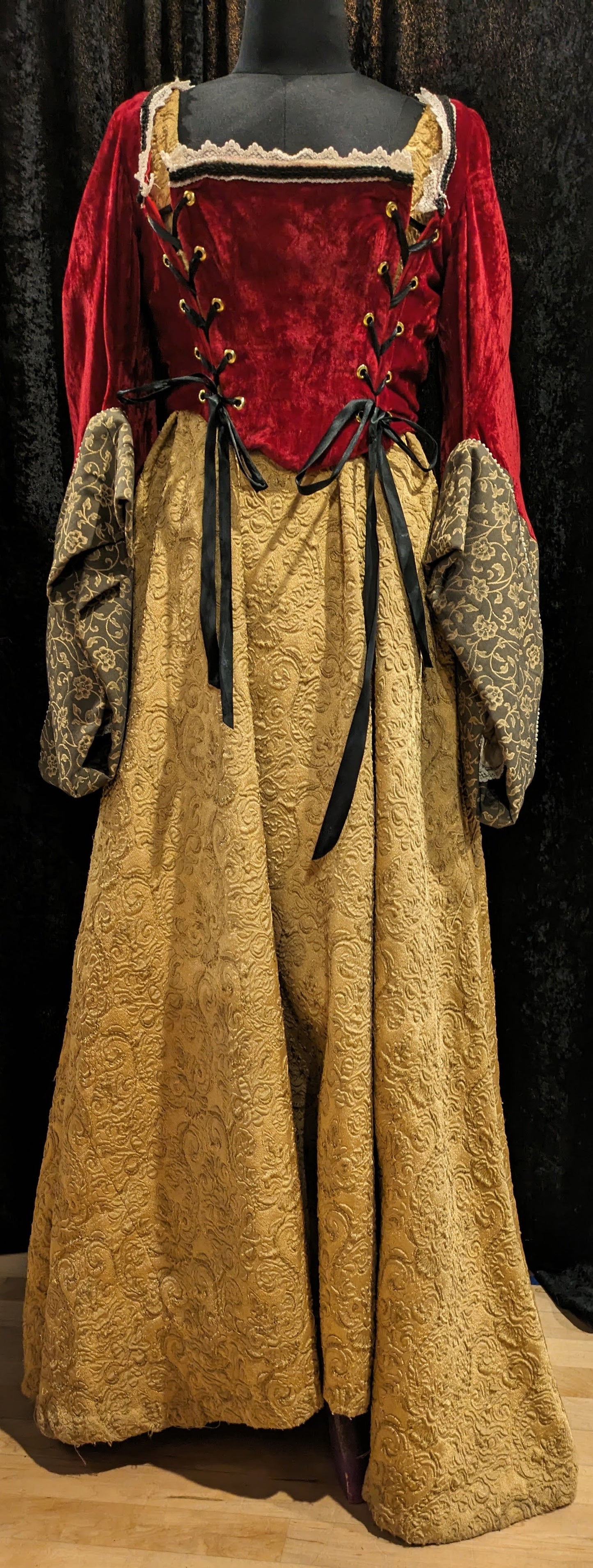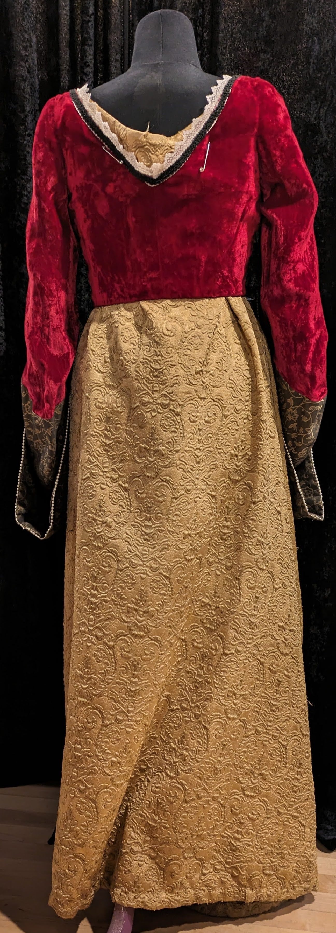 Handmade by local seamstress Margaret Proud. Golden textured undergown has billowing Satin sleeves as chemise effect, but easier to wear than multiple layers. Bodice of red velvet with draping cuffed sleeves finishes the look. Lace and pearl trim detail throughout. Brocade cuffs. Can accommodate hoopskirt for extra fullness.