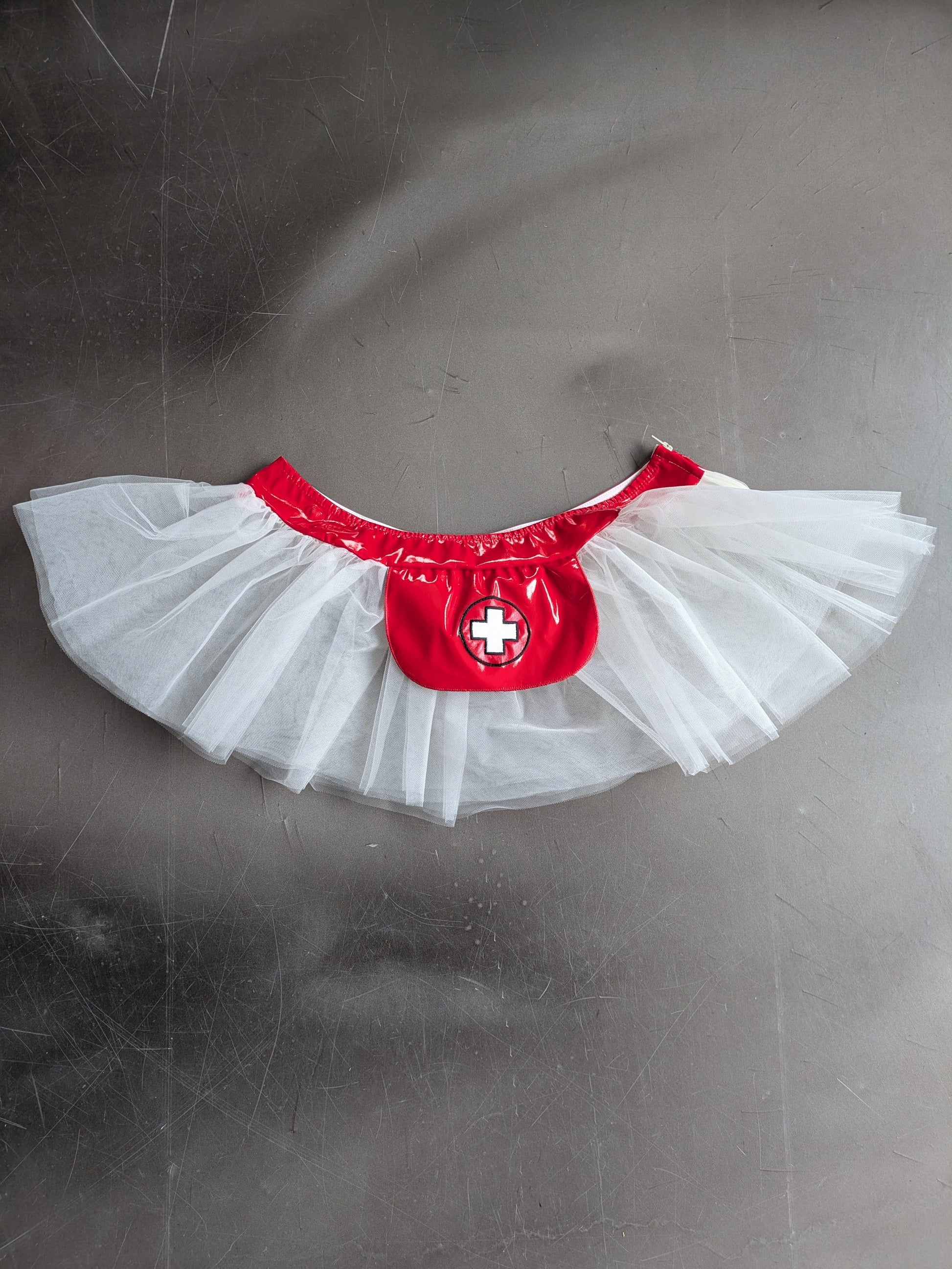 used white tutu with a red vinyl mini apron with a white cross. 30" Waist