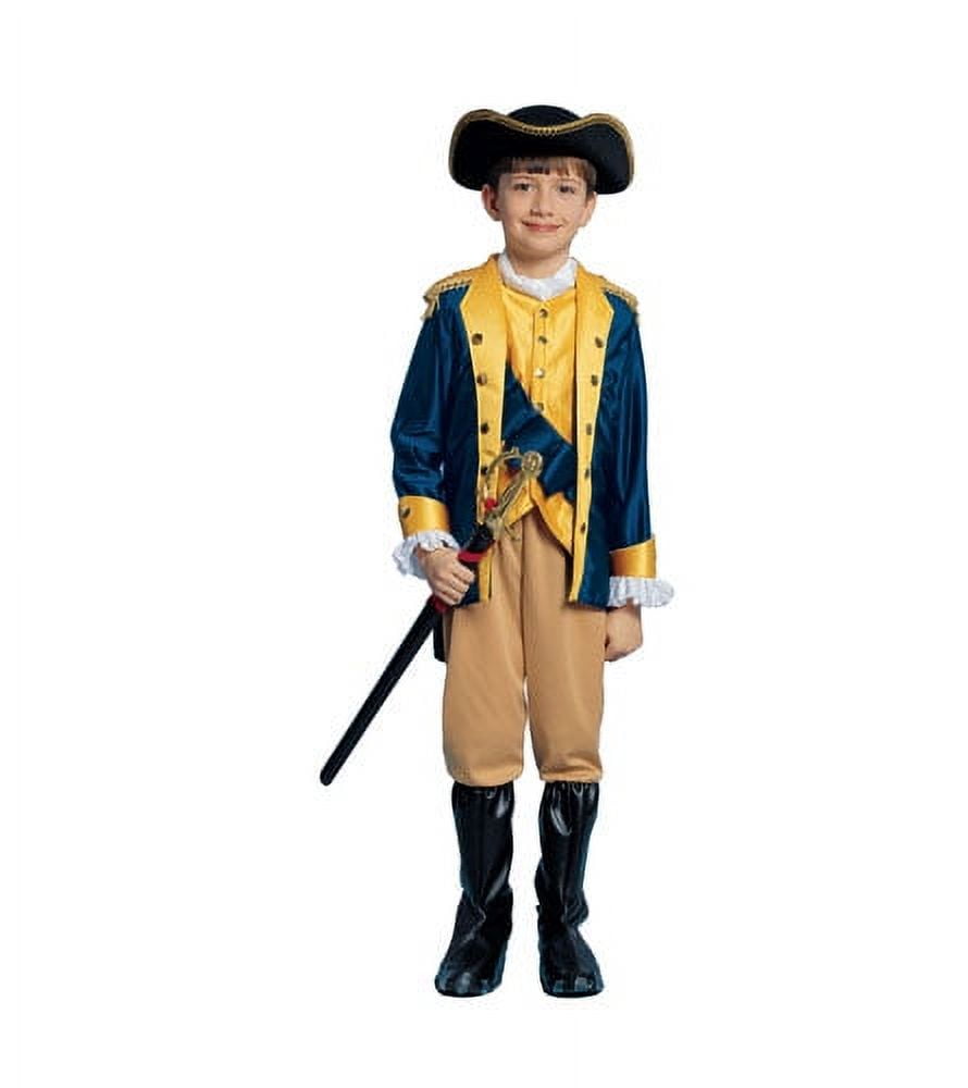 Early Americas Colonial Soldier child costume. Includes Jacket with attached vest and cuffs, knickers, boot tops, tricorn hat, and jabot.